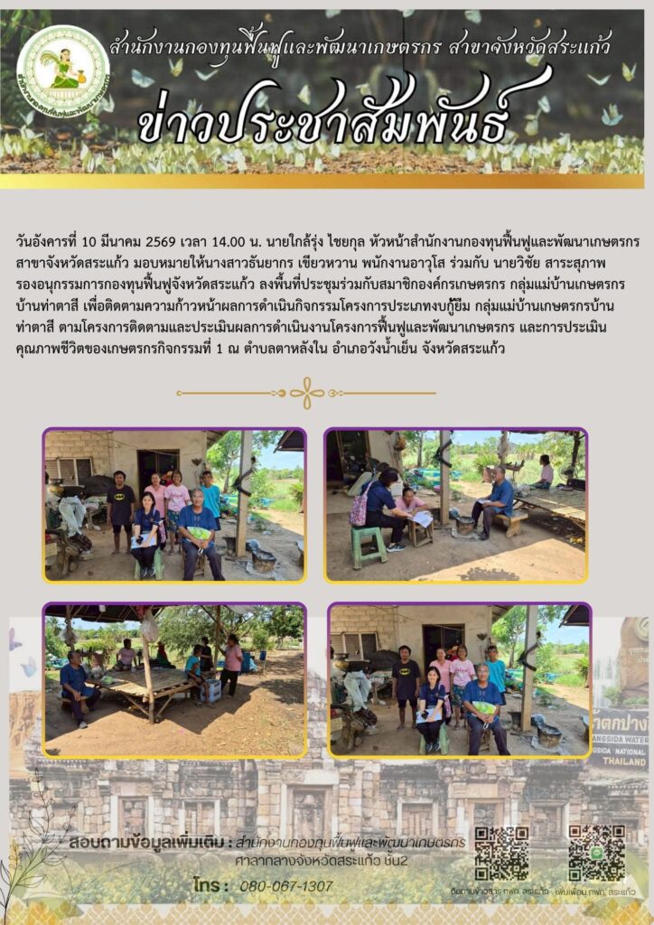 วันอังคารที่ 10 มีนาคม 2569 เวลา 14.00 น. นายใกล้รุ่ง ไชยกุล หัวหน้าสำนักงานกองทุนฟื้นฟูและพัฒนาเกษตรกร สาขาจังหวัดสระแก้ว มอบหมายให้นางสาวธันยากร เขียวหวาน พนักงานอาวุโส ร่วมกับ นายวิชัย สาระสุภาพ รองอนุกรรมการกองทุนฟื้นฟูจังหวัดสระแก้ว ลงพื้นที่ประชุมร่วมกับสมาชิกองค์กรเกษตรกร กลุ่มแม่บ้านเกษตรกรบ้านท่าตาสี เพื่อติดตามความก้าวหน้าผลการดำเนินกิจกรรมโครงการประเภทงบกู้ยืม กลุ่มแม่บ้านเกษตรกรบ้านท่าตาสี ตามโครงการติดตามและประเมินผลการดำเนินงานโครงการฟื้นฟูและพัฒนาเกษตรกร และการประเมินคุณภาพชีวิตของเกษตรกรกิจกรรมที่ 1 ณ ตำบลตาหลังใน อำเภอวังน้ำเย็น จังหวัดสระแก้ว