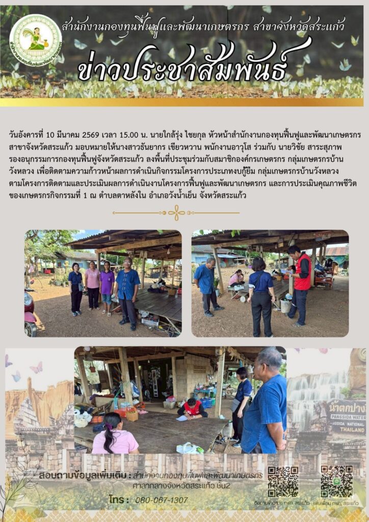 วันอังคารที่ 10 มีนาคม 2569 เวลา 15.00 น. นายใกล้รุ่ง ไชยกุล หัวหน้าสำนักงานกองทุนฟื้นฟูและพัฒนาเกษตรกร สาขาจังหวัดสระแก้ว มอบหมายให้นางสาวธันยากร เขียวหวาน พนักงานอาวุโส ร่วมกับ นายวิชัย สาระสุภาพ รองอนุกรรมการกองทุนฟื้นฟูจังหวัดสระแก้ว ลงพื้นที่ประชุมร่วมกับสมาชิกองค์กรเกษตรกร กลุ่มเกษตรกรบ้านวังหลวง เพื่อติดตามความก้าวหน้าผลการดำเนินกิจกรรมโครงการประเภทงบกู้ัยืม กลุ่มเกษตรกรบ้านวังหลวง