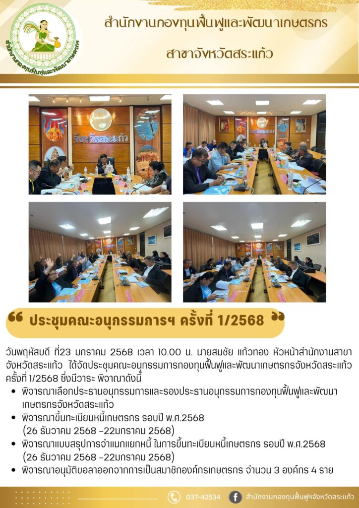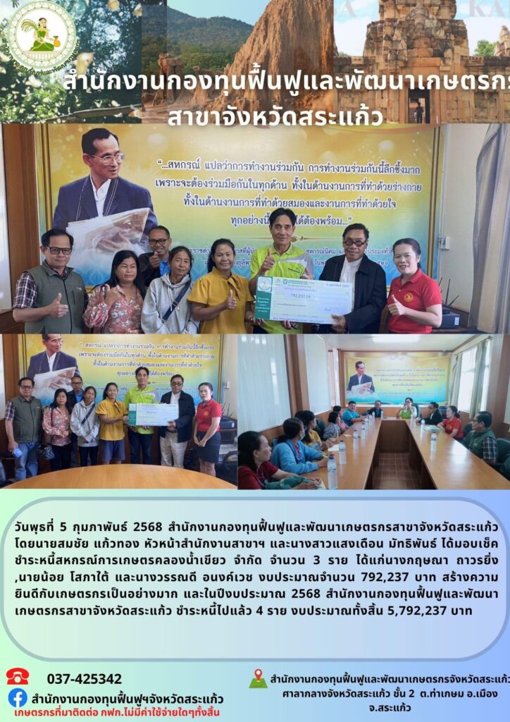 วันพุธที่ 5 กุมภาพันธ์ 2568 สำนักงานกองทุนฟื้นฟูและพัฒนาเกษตรกรสาขาจังหวัดสระแก้ว โดยนายสมชัย แก้วทอง หัวหน้าสำนักงานสาขาฯ และนางสาวแสงเดือน มัทธิพันธ์ ได้มอบเช็คชำระหนี้สหกรณ์การเกษตรคลองน้ำเขียว จำกัด จำนวน 3 ราย ได้แก่นางกฤษณา ถาวรยิ่ง ,นายน้อย โสภาใต้ และนางวรรณดี อนงค์เวช งบประมาณจำนวน 792,237 บาท สร้างความยินดีกับเกษตรกรเป็นอย่างมาก และในปีงบประมาณ 2568 สำนักงานกองทุนฟื้นฟูและพัฒนาเกษตรกรสาขาจังหวัดสระแก้ว ชำระหนี้ไปแล้ว 4 ราย งบประมาณทั้งสิ้น 5,792,237 บาท