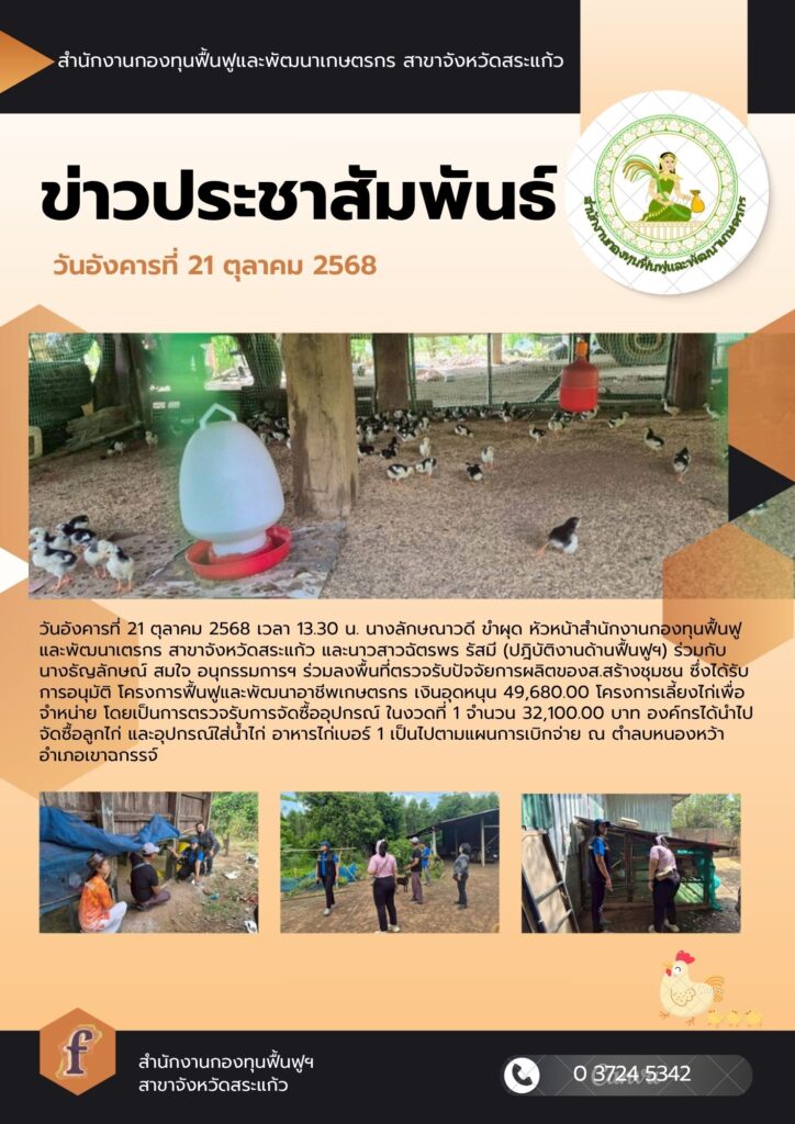 นางลักษณาวดี ขำผุด หัวหน้าสำนักงานกองทุนฟื้นฟูและพัฒนาเตรกร สาขาจังหวัดสระแก้ว และนาวสาวฉัตรพร รัสมี (ปฎิบัติงานด้านฟื้นฟูฯ) ร่วมกับนางธัญลักษณ์ สมใจ อนุกรรมการฯ ร่วมลงพื้นที่ตรวจรับปัจจัยการผลิตของส.สร้างชุมชน ซึ่งได้รับการอนุมัติ โครงการฟื้นฟูและพัฒนาอาชีพเกษตรกร เงินอุดหนุน 49,680.00 โครงการเลี้ยงไก่เพื่อจำหน่าย โดยเป็นการตรวจรับการจัดซื้ออุปกรณ์ ในงวดที่ 1 จำนวน 32,100.00 บาท องค์กรได้นำไปจัดซื้อลูกไก่ และอุปกรณ์ใส่น้ำไก่ อาหารไก่เบอร์ 1 เป็นไปตามแผนการเบิกจ่าย ณ ตำลบหนองหว้า อำเภอเขาฉกรรจ์