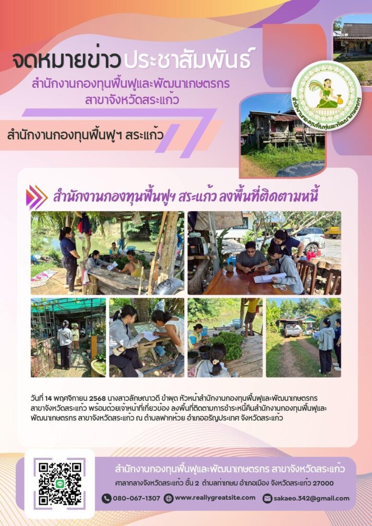 ติดตามข่าวสารสำนักงานกองทุนฟื้นฟูและพัฒนาเกษตรกร สาขาจังหวัดสระแก้ว ผ่านทาง