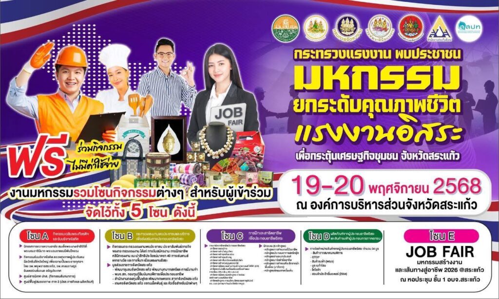 วันที่ 19 พฤศจิกายน 2568 นางสาวลักษณาวดี ขำผุด หัวหน้าสำนักงานกองทุนฟื้นฟูและพัฒนาเกษตรกร สาขาจังหวัดสระแก้ว ร่วมเป็นเกียรติในพิธีเปิด “มหกรรมยกระดับคุณภาพชีวิตแรงงานอิสระ เพื่อกระตุ้นเศรษฐกิจชุมชน จังหวัดสระแก้ว” และงาน “Job Fair มหกรรมสร้างงานและเส้นทางสู่อาชีพ 2026 @สระแก้ว โดยมีนางสาวตรีนุช เทียนทอง รัฐมนตรีว่าการกระทรวงแรงงาน เป็นประธานเปิดงาน และมีนายสันติ บัณฑสุวรรณ รองปลัดกระทรวงแรงงาน พร้อมด้วยรองผู้ว่าราชการจังหวัดสระแก้ว ผู้บริหารระดับสูงกระทรวงแรงงาน หัวหน้าส่วนราชการ อาสาสมัครแรงงาน บัณฑิตแรงงาน สถานประกอบการ และประชาชนในพื้นที่เข้าร่วมอย่างคับคั่ง ณ อาคารโดมอเนกประสงค์และหอประชุมใหญ่ ชั้น 1 องค์การบริหารส่วนจังหวัดสระแก้ว