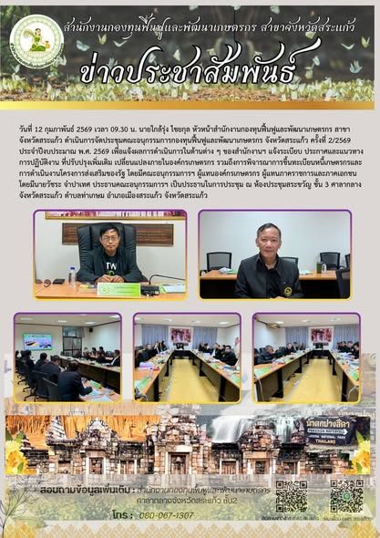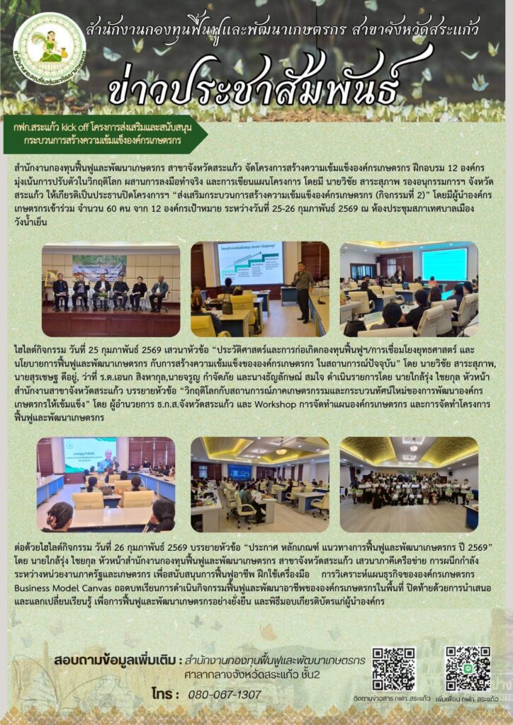สำนักงานกองทุนฟื้นฟูและพัฒนาเกษตรกร สาขาจังหวัดสระแก้ว จัดโครงการสร้างความเข้มแข็งองค์กรเกษตรกร ฝึกอบรม 12 องค์กร มุ่งเน้นการปรับตัวในวิกฤติโลก ผสานการลงมือทำจริง และการเขียนแผนโครงการ โดยมี นายวิชัย สาระสุภาพ รองอนุกรรมการฯ จังหวัดสระแก้ว ให้เกียรติเป็นประธานปิดโครงการฯ “ส่งเสริมกระบวนการสร้างความเข้มแข็งองค์กรเกษตรกร (กิจกรรมที่ 2)” โดยมีผู้นำองค์กรเกษตรกรเข้าร่วม จำนวน 60 คน จาก 12 องค์กรเป้าหมาย ระหว่างวันที่ 25-26 กุมภาพันธ์ 2569 ณ ห้องประชุมสภาเทศบาลเมืองวังน้ำเย็น