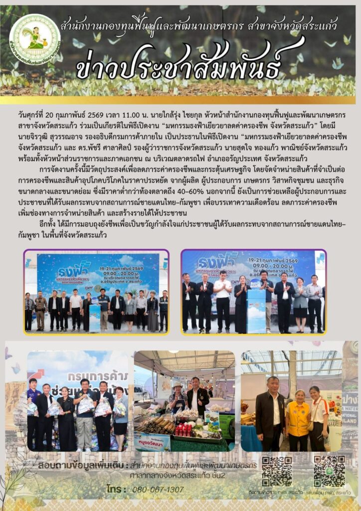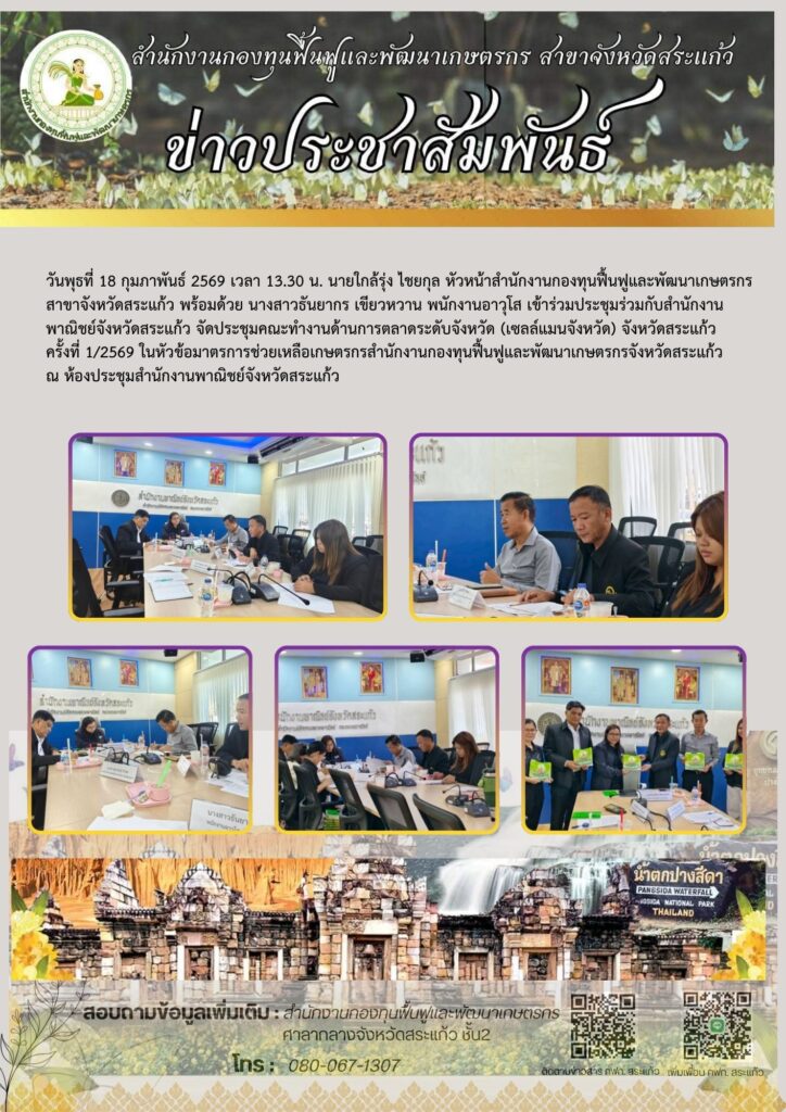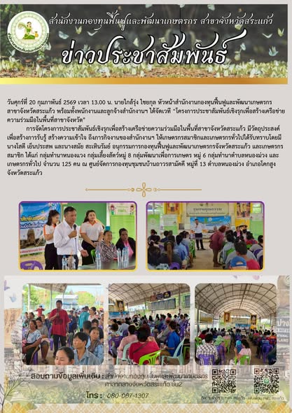 ไฮไลต์กิจกรรม วันที่ 25 กุมภาพันธ์ 2569 เสวนาหัวข้อ “ประวัติศาสตร์และการก่อเกิดกองทุนฟื้นฟูฯ/การเชื่อมโยงยุทธศาสตร์ และนโยบายการฟื้นฟูและพัฒนาเกษตรกร กับการสร้างความเข้มแข็งขององค์กรเกษตรกร ในสถานการณ์ปัจจุบัน” โดย นายวิชัย สาระสุภาพ, นายสุรเชษฐ ดีอยู่, ว่าที่ ร.ต.เอนก สิงหากุล,นายจรูญ กำจัดภัย และนางธัญลักษณ์ สมใจ ดำเนินรายการโดย นายใกล้รุ่ง ไชยกุล หัวหน้าสำนักงานสาขาจังหวัดสระแก้ว บรรยายหัวข้อ “วิกฤติโลกกับสถานการณ์ภาคเกษตรกรรมและกระบวนทัศน์ใหม่ของการพัฒนาองค์กรเกษตรกรให้เข้มแข็ง” โดย ผู้อำนวยการ ธ.ก.ส.จังหวัดสระแก้ว และ Workshop การจัดทำแผนองค์กรเกษตรกร และการจัดทำโครงการฟื้นฟูและพัฒนาเกษตรกร